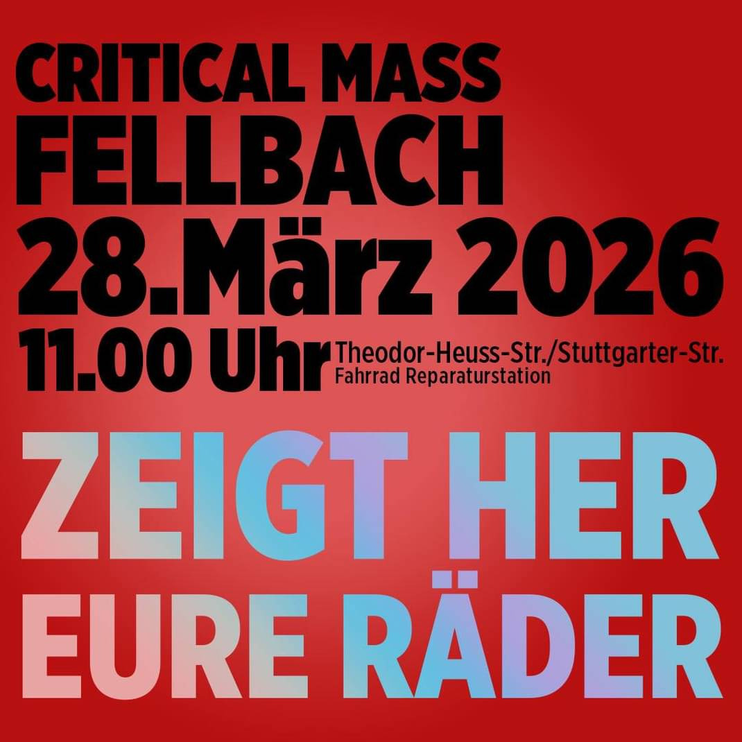 Am 28. März 2026 ist es endlich wieder soweit – zeigt her eure RäderWir treffen uns ab 11.00 Uhr in der Theodor-Heuss-Straße, Ecke Stuttgarter-Straße und fahren gut gelaunt, bunt und mit Musik durch Fellbach.Wenn wir mehr als 15 Radfahrende sind, fahren wir als Verband auf den Straßen durch Fellbach. Und zwar ausdrücklich nicht auf den […] |