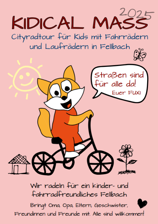 ![]() Cityradtour für Kids mit Fahrrädern und Laufrädern in FellbachKinder- und fahrradfreundliche Mobilität beginnt vor Ort. Auch in Fellbach gibt es noch viel Luft nach oben. Es ist an der Zeit, dass unsere Stadt ihren Handlungsspielraum voll ausschöpft. Wir radeln für ein kinder- und fahrradfreundliches Fellbach. Bringt Oma, Opa, Eltern, Geschwister, Freundinnen und Freunde mit. Alle […] |